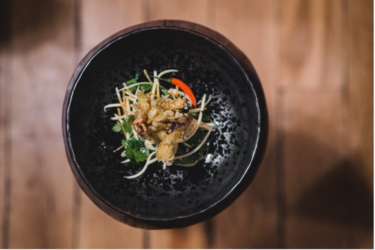 Nyní oloupeme zelená manga a pomocí asijské škrabky je nastrouháme na dlouhé tenké nudličky (julienne). Baby špenát necháme odmočit ve studené vodě. Omyjeme a natrháme koriandrové a mátové listy, osušíme je a promícháme s mangem. V menší misce smícháme rybí omáčku, hnědý cukr, kokosové mléko a limetkovou šťávu a dobře rozmícháme, aby se nám rozpustil cukr. Nasekáme chilli papričky a přidáme je do dresinku.
